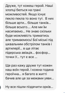 Щойно з передової скинули хлопці повідомлення: я багато бачив в своєму житті, але те що зараз тут відбуваєтсья це взагалі за межами уяви. В них більше всього, але ми всерівно стоїмо..
