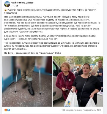 У Дніпрі співробітники ОСББ не дозволили пораненому бійцю скористатися ліфтом через борги його сім’ї. Військовий нещодавно повернувся із фронту на лікування. Поранення боєць отримав під час виконання бойового завдання. Втім усі ці нюанси не хвилювали співробітників ОСББ. З переломом ноги, на милицях вони змусили пораненого військового підійматися на 10 поверх самотужки. Ліфтом не дозволили скористатися через те, що сім’я бійця має борги за комунальні послуги.