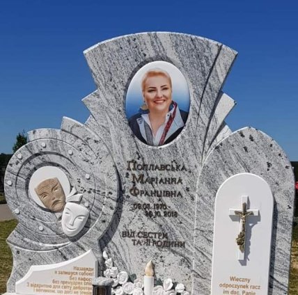 На постаменті також розташована книга, що символізує професію Поплавської, адже вона була вчителькою. Окрім цього, там є підсвічники, живі квіти і невеликі арки.