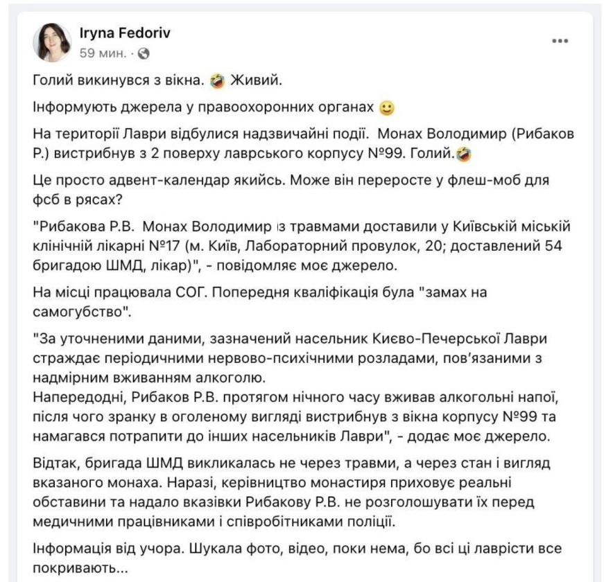 “За уточненими даними, зазначений насельник Києво-Печерської Лаври страждає періодичними нервово-психічними розладами, пов’язаними з надмірним вживанням алкоголю. Напередодні, Рибаков Р.В. протягом нічного часу вживав алкогольні напої, після чого зранку в ог0лен0му вигляді вистрибнув з вікна корпусу №99 та намагався потрапити до інших насельників Лаври”, – додає Джерело.Відтак, бригаду швидкої медичної допомоги викликали не через травми, а через стан і ог0ленuй вигляд монаха.Федорів зазначає, що керівництво монастиря приховує реальні обставини та надало вказівки Рибакову не розголошувати їх перед медиками та поліціянтами.Журналістка уточнила, що інформацію про інцидент отримала вчора. “Шукала фото, відео, поки нема, бо всі ці лаврісти все покривають”, – додала Федорів.