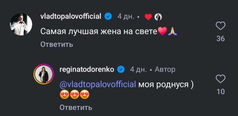 “Обожаю Регину и все, что она делает”, “Региночка лучшая”, “Как Влад поддерживает жену в комментариях. Они такие душки”, “Регина, надеюсь, это парик”, “Совсем не ваш цвет. И эта прическа вас старит”, — спорят в обсуждениях поклонники Тодоренко.
