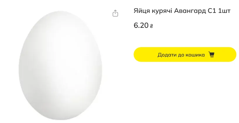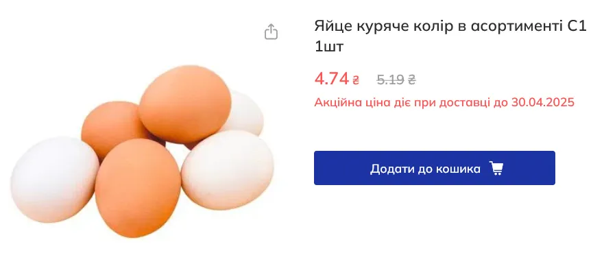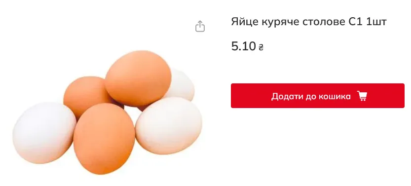 Загалом в окремих мережах такі яйця можна було купити за 4,81-6,2 грн/штука (48,1-62 грн/десяток). Зокрема:
