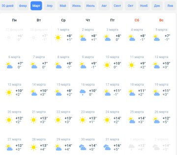 У той же час, синоптики сайту Meteoprog дають більш втішний прогноз на березень. За їх даними, погода в перший місяць весни по Україні буде вищою за середню. Тобто з перших днів температура повітря сягатиме +7..+8 градусів, а вночі — від 0 до +1. Зазначимо, що середня температура повітря в Україні в березні – +2…+4 градуси вдень і до +1 градуси вночі.