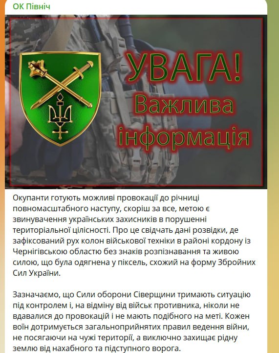 Про це свідчать дані розвідки, де зафіксований рух колон військової техніки в районі кордону із Чернігівською областю без знаків розпізнавання та живою силою, що була одягнена у піксель, схожий на форму ЗСУ”, – йдеться в повідомленні.