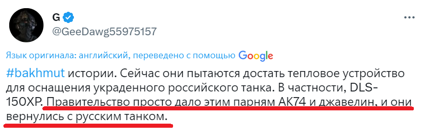 Українські військові “засвітили” ПТРК та імітували підготовку до пуску ракети, після чого росіяни залишили танк і кинулися тікати, побоюючись загинути у підбитій машині. Українські військові провели операцію на передовій під Бахмутом, в результаті якої змогли обдурити росіян і захопити трофейний танк, який тепер знаходиться у розпорядженні ЗСУ. Історію від своїх українських джерел отримав та опублікував капітан армії США, який веде обліковий запис у соціальній мережі Twitter під ніком Havoc Six.