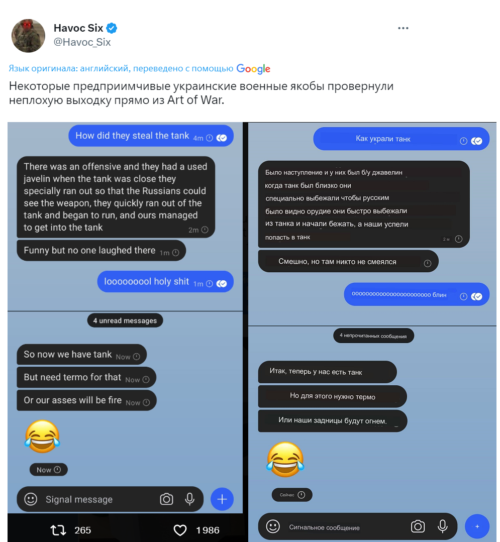 Зафіксувавши втечу росіян, українські військові оперативно взяли під контроль танк та вивели його на українські позиції. “Смішно, але там ніхто не сміявся”, – зазначено у повідомленні. “Іноді на війні відбуваються дивовижні речі”, – зазначає американський військовий. Наразі вони намагаються дістати тепловізор для оснащення вкраденого танка. “Командир просто дав цим хлопцям АК74 та “Джавелін”, і вони повернулися з російським танком”, – коментують повідомлення американські користувачі.