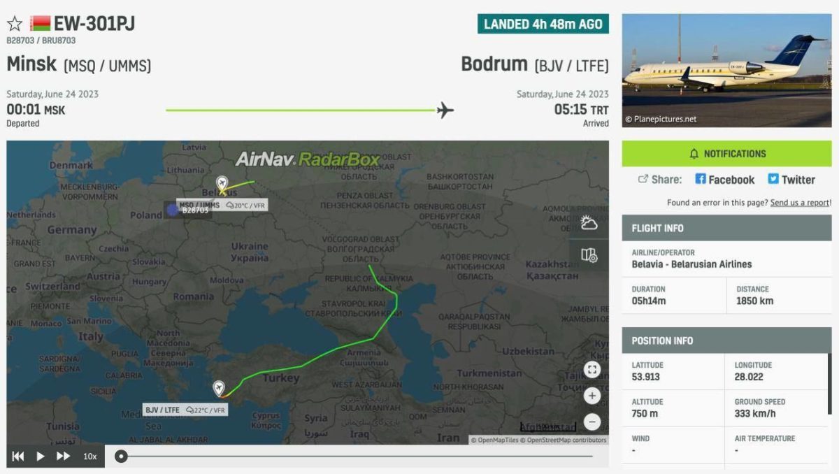 Про це повідомляє портал Reform.by із посиланням на дані про маршрути польотів порталу Radarbox. За їхніми даними, йдеться про борт Canadair CL-600-2B19 Challenger 850 з номером EW-301PJ. Бізнес-джет вилетів із Національного аеропорту о 00.01 ночі 24 червня та о 5-й ранку приземлився у Туреччині.