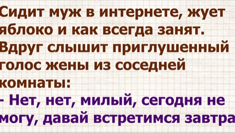 Сидит муж в интернете, жует яблоко и как всегда занят. Вдруг слышит приглушенный голос жены из соседней комнаты:— Нет, нет, милый, сегодня не могу, давай встретимся завтра.
