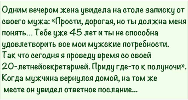 «Прости, дорогая, но тебе уже 45 лет…»Он думал, что его жене будет нечем ответить, однако, как оказалось, в этом очень сильно заблуждался.Одним вечером жена увидела на столе записку от своего мужа: «Прости, дорогая, но ты должна меня понять… Тебе уже 45 лет и ты не способна удовлетворить все мои мужские потребности. Так что сегодня я проведу время со своей 20-летней секретаршей. Приду где-то к полуночи».