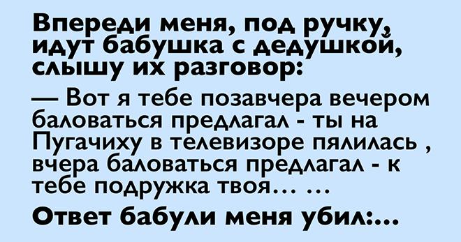 Так как плетемся мы все вместе по льду, который наши коммунальщики принципиально видимо не убирают, я слышу их разговор. Дедушка на бабушку ворчит: «Вот я тебе позавчера вечером баловаться предлагал -ты на Пугачиху в телевизоре пялилась , вчера баловаться предлагал — к тебе подружка твоя карга старая пришла, и вы всему дому кости мыли, сегодня утром баловаться предлагал — ты гладила. Сегодня вечером уже не предложу, внуков привезут на неделю!!!!!А я может неделю не проживу ещё, мне 76 уже!!!! Вот помру, и ходи, как дура до смерти небалованная, но зато с Пугачевой, и подружкой своей. Вся глаженная да не балованная!»