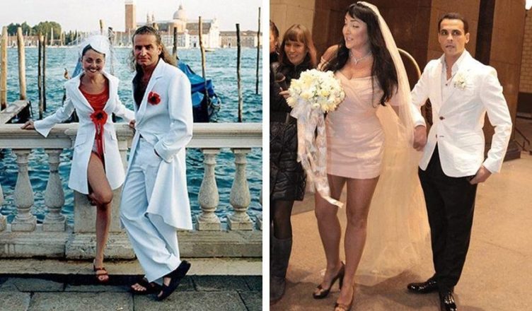 У Сергея Жукова из “Руки вверх” и его избранницы Регины Бурд было пять свадеб. На самой дорогой церемонии, прошедшей на итальянском озере Комо, невеста решила сэкономить на платье. Певица хотела себе простое платье с открытыми плечами, но в итоге получила “банное полотенце”. На фоне нарядного мужа она выглядела странно.