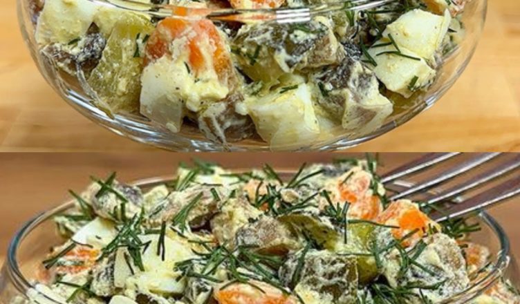 Отварите 4 яйца. Нарежьте 400 г грибов кубиками. Растопите на сковороде 50 г сливочного масла и обжарьте грибы 5-7 минут с добавлением соли. Продолжайте жарить еще 1-2 минуты. Снимите с плиты и дайте им остыть. Нарежьте кубиками 250 г маринованных огурцов и 3 вареной моркови.