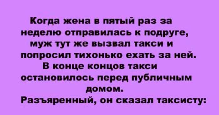 Когда жена в пятый раз за неделю отправилась к подруге, муж тут же вызвал такси и попросил тихонько ехать за ней. В конце концов такси остановилось перед публичным домом.