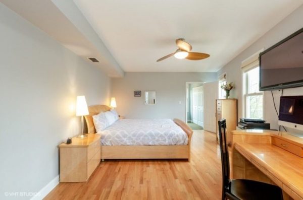 Изнутри дом обшит сайдингом, и является вполне просторным, несмотря на то, что одна его сторона узкая. Внутри комфортно разместились кухня, столовая и гостиная, а также на втором этаже находятся две спальни, каждая из которых имеет собственную ванную комнату. Отдельный санузел находится как раз в узкой части дома.