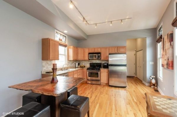 Зоны между кухней столовой разделены освещением, которое выполнено прямыми линиями.