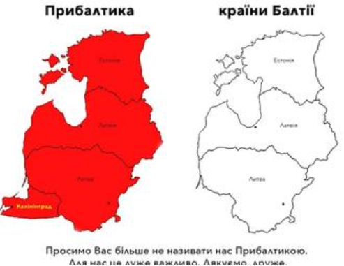 Подаємо мовою оригіналу: Žilvinas Svitojus Дуже мало народів, які вас так люблять і поважають, як країни Балтії. Стільки десятиліть ми називали Львів Львовом, Київ Києвом і т. д. Не тому, що нам більше подобалося, а тому, що ми не знали кращого. Ми більше так не робимо. Ми навчилися правильно вимовляти Україна, і нам буде соромно за будь-кого, хто скаже «на Україну». Ми були б дуже вдячні, якби зробили нам цю незначну послугу: будь ласка, більше не називайте нас Прибалтикою. Ми країни Балтії. Ваші друзі та союзники. Якщо ви знаєте когось, хто все ще використовує цей термін — надішліть йому це зображення.