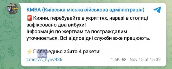 У КМВА зазначають, що станом на 15:32 над столицею збили чотири ворожі ракети. В області працює ППО. Голова Київської ОВА Олексій Кулеба закликає міцевих жителів залишатись в укриттях, не фотографувати та не знімати місця прильотів. Після ракетних влучань усі спецслужби міста негайно вирушили на місце події. Інформація щодо жертв та постраждалих наразі уточнюється.