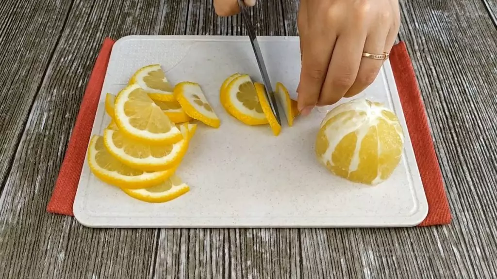 Берем один большой лимон, разрезаем его пополам. С одной половины аккуратно снимаем кожуру и избавляемся от семян. Вторую половину нарезаем на мелкие дольки.