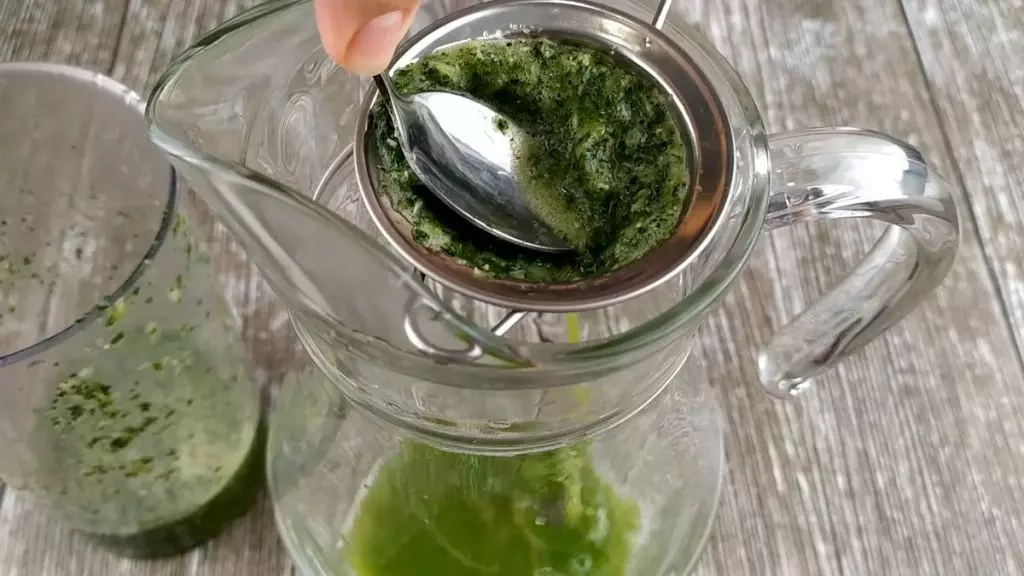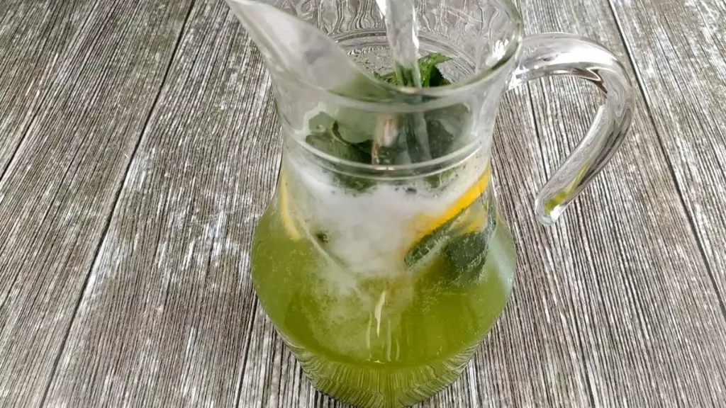 Через сито процеживаем эту массу в кувшин, чтобы получить концентрат из мяты и лимона.