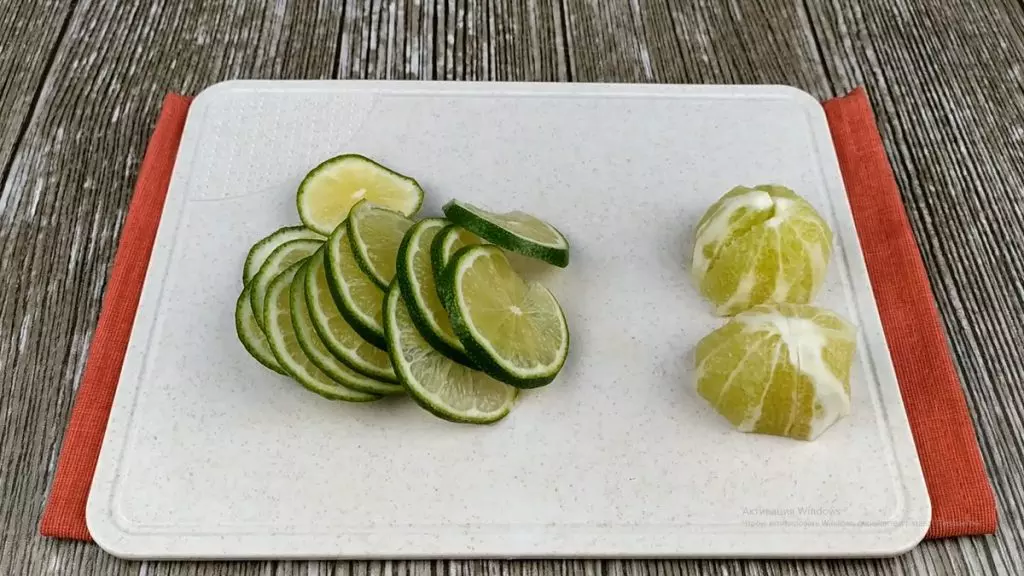 Теперь готовим мохито с лаймом. Берем 2 лайма: очищаем один от кожуры и на кусочки нарезаем, удаляя косточки, а второй нарезаем на тонкие дольки.