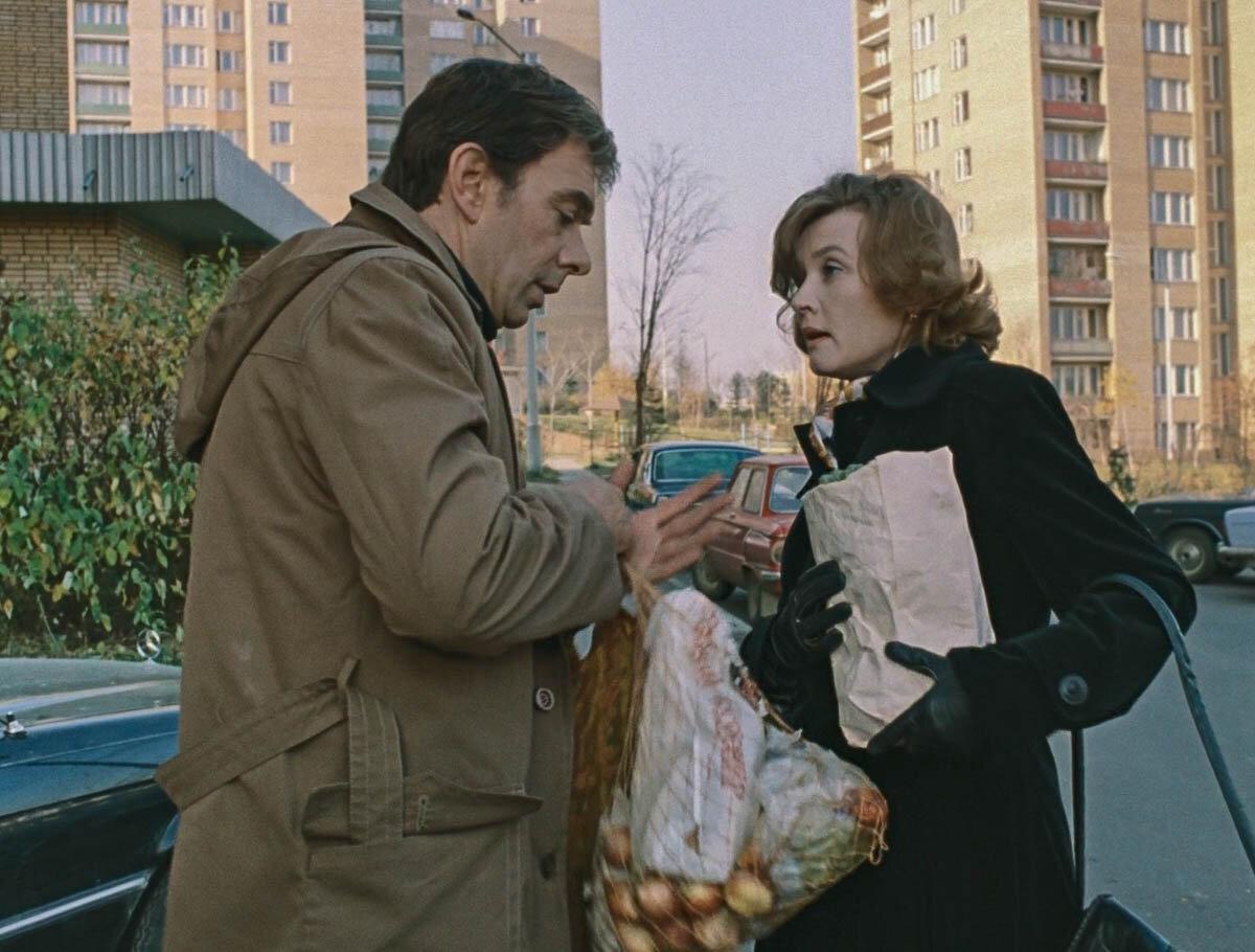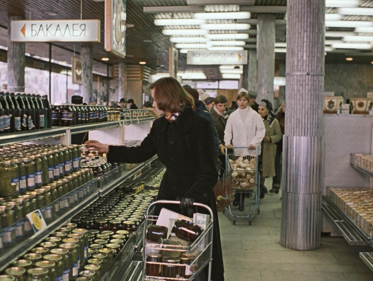 Давайте восстановим хронологию событий. Итак, Володя говорит Кате, мол, сдавай машину в ремонт, а то дело плохо кончится. Между прочим, с автосервисами в СССР были серьезные проблемы. В частности, очереди. Именно чтобы не ждать долгие месяцы героиня фильма «Полуденный вор» Раиса Глазунова доверила ремонт автомобиля уголовнику и пьянице Молоткову. Но Катерина, как директор комбината, скорее всего воспользовалась связями. И ее «Жигули» приняли в ремонт, что называется, по-быстрому.Теперь переходим к сцене в магазине. Прежде всего: расскажите, неужели реально в Советском Союзе существовали супермаркеты самообслуживания? А как же боролись с воришками? Видеокамер-то еще не существовало. Лично я тоже успел пожить в СССР, но запомнил исключительно магазины прилавочного типа. В фильме Меньшова показывают какую-то сказочку. Зато очень хорошо продемонстрирован дефицит — в виде одинаковых рядов банок и бутылок. А когда привозят колбасу, покупатели сразу же набрасываются на нее, как будто увидели в первый раз за долгие месяцы. Включая Катерину, у которой наверняка было побольше возможностей достать редкие продукты. И теперь посмотрим на тележку Катерины. Что там было?
