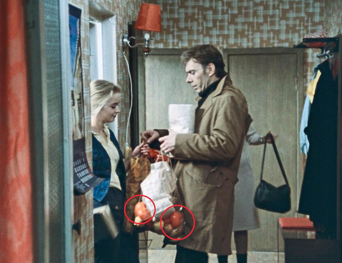 Но еще более нелогично следующее обстоятельство. В телеге у Кати я насчитал минимум семь (!) банок. По меньшей мере одна трехлитровая и шесть штук от литра до полутора. Еще одну трехлитровую банку Екатерина берет с витрины. Вес всего этого хозяйства составил не менее 10 — 15 килограмм, а скорее всего ближе именно к пятнадцати. Просто попробуйте пойти в обычный супермаркет, напихать в тележку банок и потом оторвать их от земли. А еще у Кати там лежат какие-то коробки. И она тащила на себе 20 килограмм? Почему не привлекла дочку?А может и не тащила. Все дело в том, что когда директор комбината встречается со слесарем Гошей около подъезда своего элитного дома на Мосфильмовской, у нее, во-первых, в руках авоська с огромным количеством лука.
