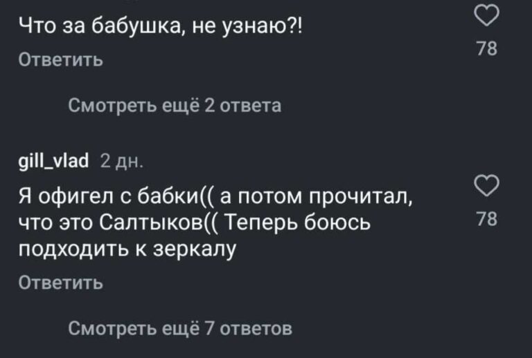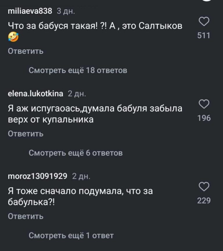 “Я думала бабуся забыла верх от комплекта”, “Нельзя себя так запускать”, “Я думала бабка, а это Салтыков”, “Бывшая все соки выпила”, “Как располнел”, “Витя, срочно в зал”,