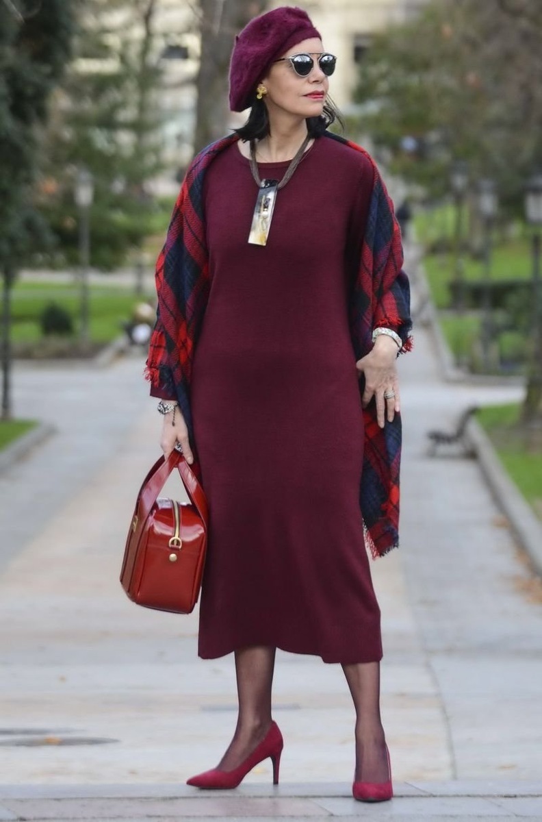 Клетчатый красно-чёрный палантин, вишнёвый берет и красная кожаная сумка добавляют завершённости и элегантности этому образу.