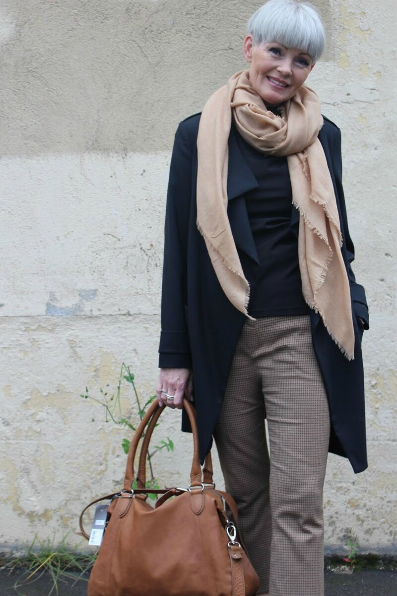 Добавьте бежевый шарф и большую сумку тёплого кофейного оттенка для создания стильного контраста.