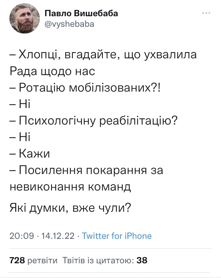 Чи означає це, що ми не бачимо намагання закрити дірки на передовій мобілізованими, без надання їм відповідного озброєння і артприкриття, без належної підготовки? Чи означає це, що ми не бачимо, як окремі командири прагнуть нагород і посад ціною сотень життів? Що ми не бачимо, як нівелювалася цінність людського життя для багатьох офіцерів? Що ми не бачимо внутрішніх розборок або намагання позбутися свідків попередніх промахів командування, відправивши їх у саме пекло? А головне – ми дуже добре бачимо, як тих, хто врятувався сам і вивів побратимів живими з м‘ясорубки, намагаються зробити боягузами, зрадниками і дезертирами. Перекладаючи відповідальність командирів за провальні операції на тих, хто на передку.