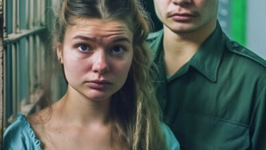 \Новенькая зечка, только что прибывшая в тюрьму, тихо шла по коридору под строгим взглядом конвоира. Её глаза были полны страха, но она старалась
